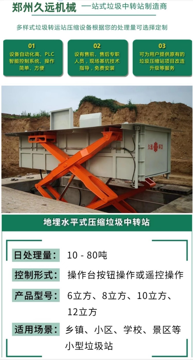 水平式生活垃圾壓縮中轉(zhuǎn)設(shè)備是將垃圾的卸(出)料、壓縮、儲(chǔ)存集合在一起,整體落于地下,利用地下空間將垃圾密閉在箱體內(nèi),地面上無垃圾外露現(xiàn)象,壓縮垃圾產(chǎn)生的污水經(jīng)排污管道直接流入污水井內(nèi),然后由污水泵排到城市污水管網(wǎng),徹底解決了垃圾在收集、儲(chǔ)存、裝運(yùn)過程中的污染環(huán)境、作業(yè)效率低等問題。